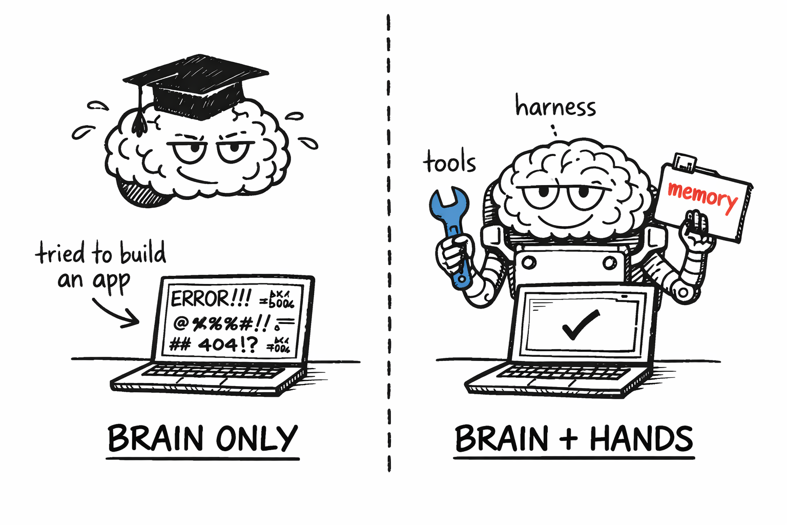 Both sides have gotten dramatically better in the past two years. Models have gone from party tricks to genuine reasoning engines. Harnesses have evolved from simple prompt templates to systems with persistent memory, tool use, multi-agent coordination, and self-verification loops. The best AI workflows are the ones where both the brain and the hands are strong and well-matched.