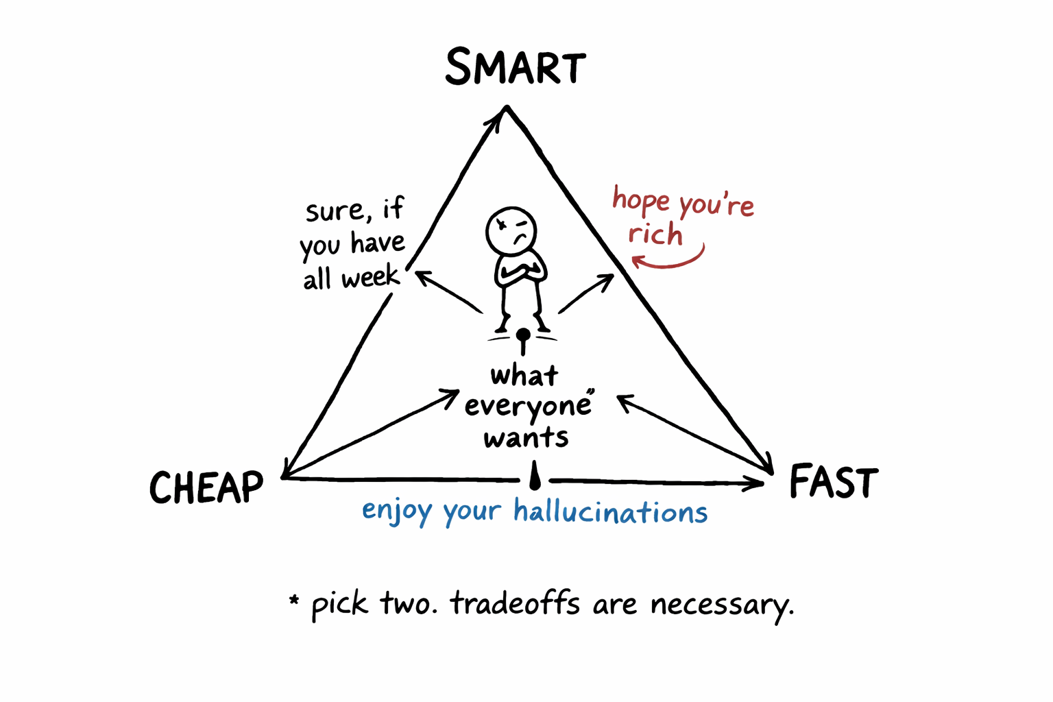 High quality and low latency? Expensive. You're running the biggest model on dedicated hardware. High quality and low cost? Slow, because you're batching requests and waiting for off-peak pricing. Low cost and low latency? Lower quality, a small, fast model that makes more mistakes.