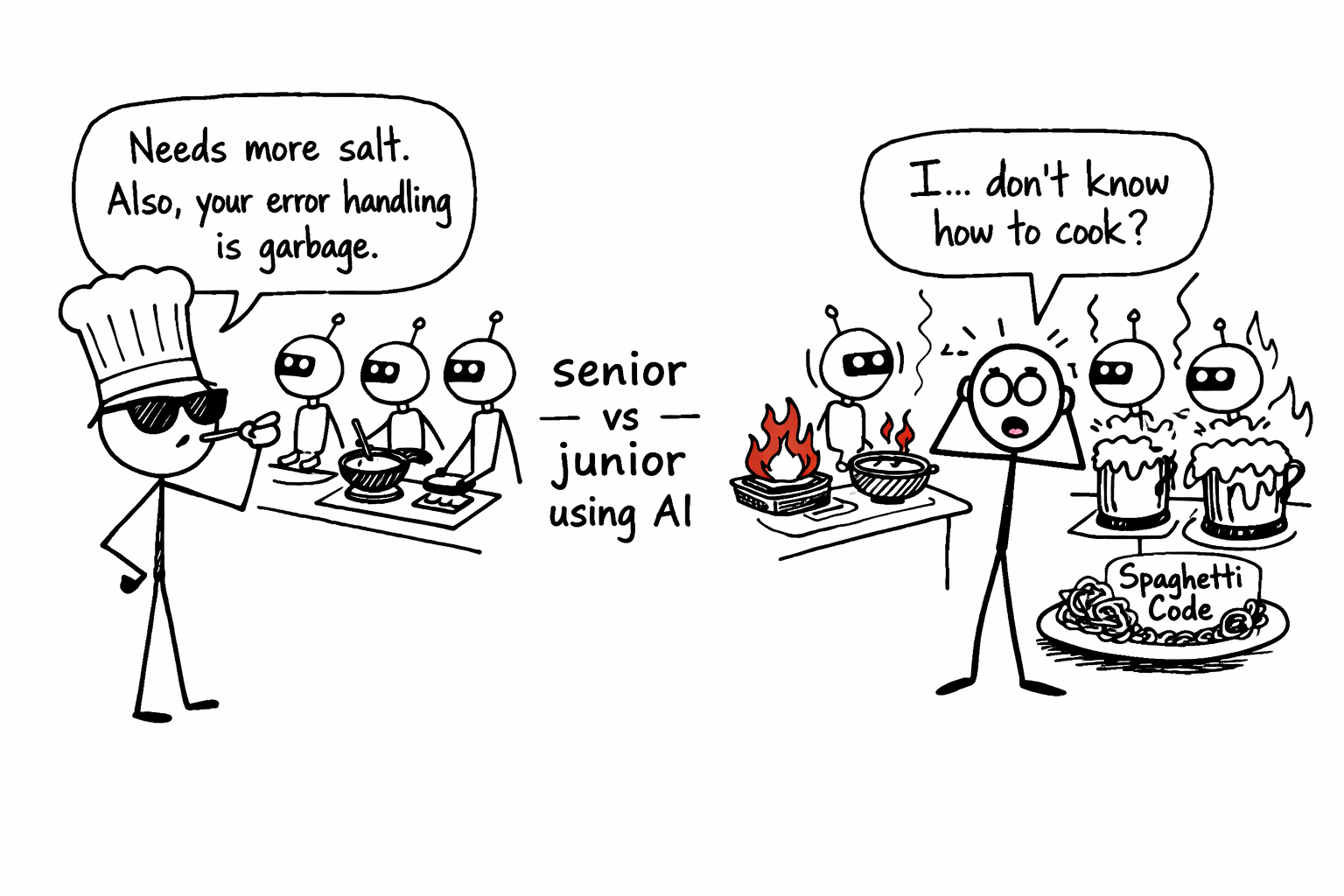 A junior who's never written much code on their own is trying to run a kitchen full of AI cooks without knowing how to cook. Everything looks fine until something catches fire, and they're standing there going "I... don't know how to cook?"